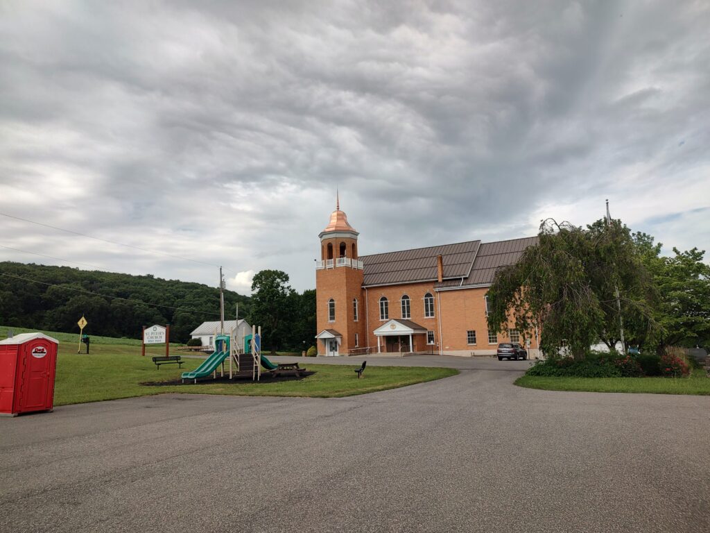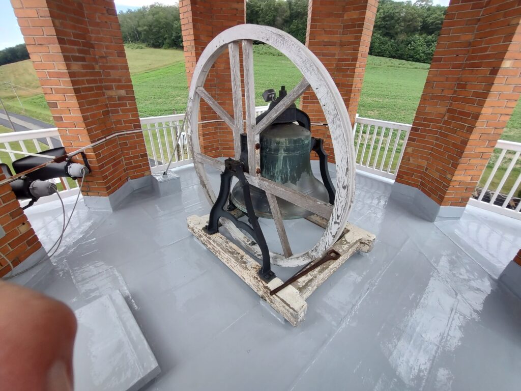 Project Description/Scope of Work: The church is situated in a lovely farm valley and experiences high winds throughout the year. In late January, a strong wind dislodged 2 of the 8 sections of copper on the existing steeple exposing the wood framing to the weather. A local contractor resecured the loose areas with face fasteners and applied membrane to temporarily protect the structure. They could not replace in like kind, so the church reached out to various contacts and after some searching found us. We met to discuss their needs and determined a similar style 16 oz. copper roofing system would be the best system with enhancements to the edge detail to prevent wind uplift. Even though the original rolled edge with face driven nails lasted 100 years. Work from a 135-foot man lift began in May and was completed in June due to the wet conditions. Kevin was lead foreman and Cade/Terry were assistant craftsmen. All three have copper experience and the final project included a soffit system to eliminate painting and epoxy coating at the floor to prolong the useable life of the existing lead coated copper roof.